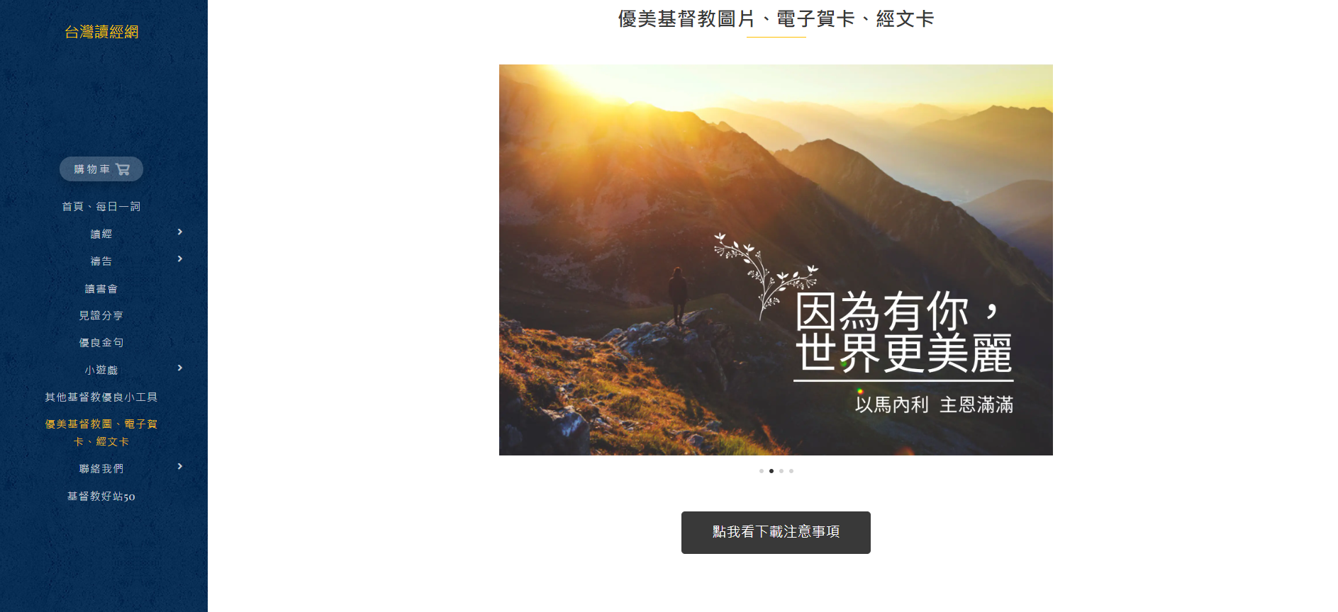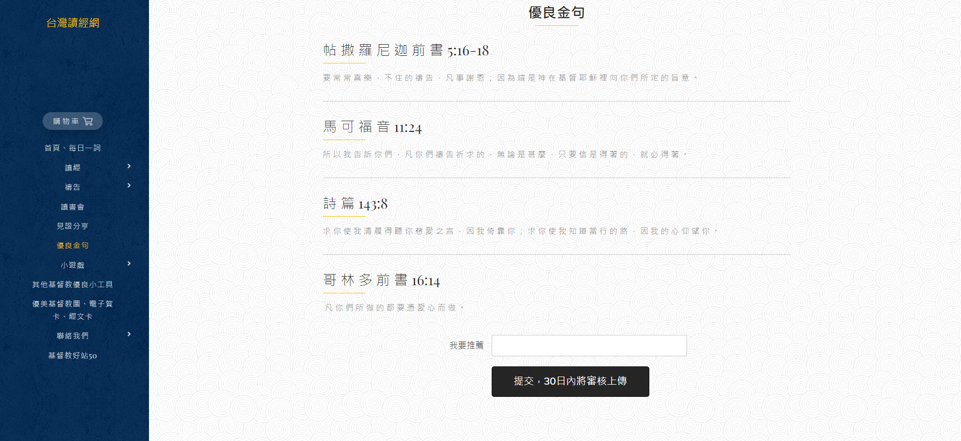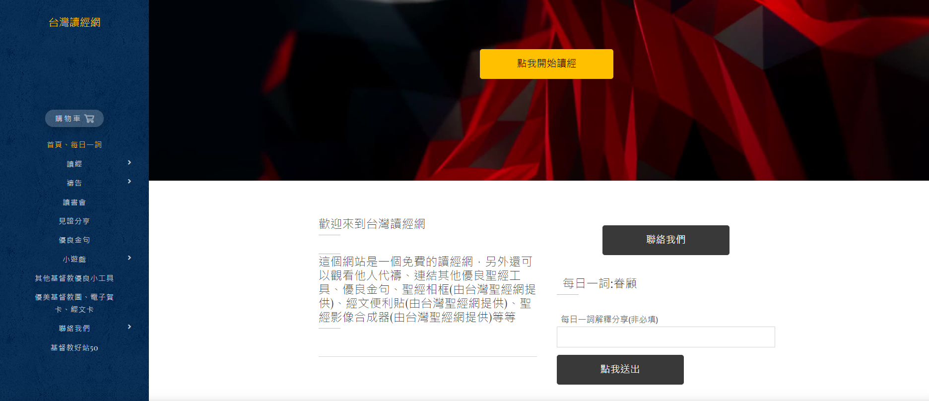這個網站是一個免費的讀經網,另外還可以觀看他人代禱、連結其他優良聖經工具、優良金句、聖經相框(由台灣聖經網提供)、經文便利貼(由台灣聖經網提供)、聖經影像合成器(由台灣聖經網提供)等